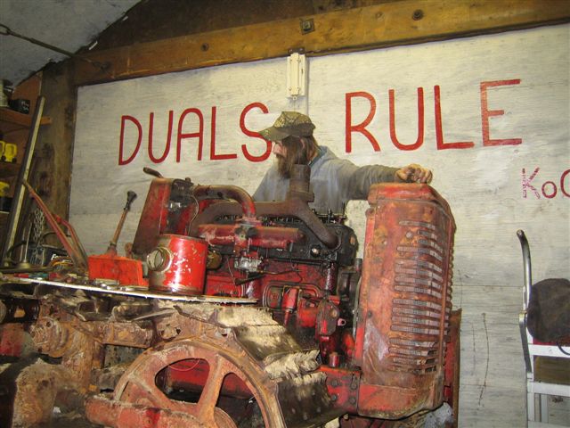 THE "KING" REASSEMBLING THE ENGINE IN THE LITTLE SHOP WITH THE NEW LOGO PAINTED ON THE DOORS.