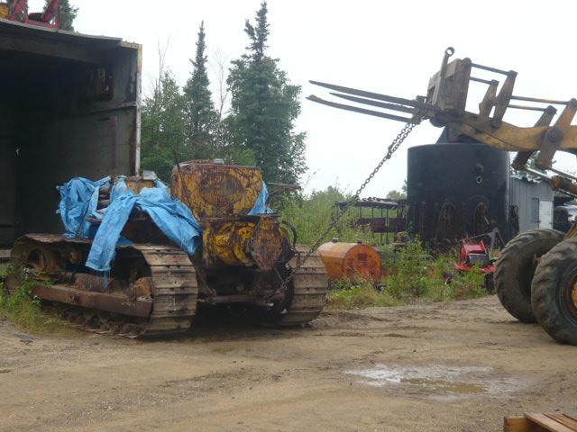 USING MY CATERPILLAR 922 LOADER TO DRAG "JACK" OUT OF THE STORAGE SHED.