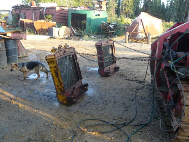 AFTER A COUPLE OF GOOD EVENING PLAYING WITH "DUALLY", THE STEERING CLUTCHES ARE STILL SEIZED. THIS IS NOT REALLY A PROBLEM BECAUSE THAT IS WHY I PUT BOAT ANCHOR HEADS ON TO FIND THESE THINGS OUT IN THE HEAT OF THE SUMMER. I DECIDED TO REMOVE THE CATERPILLAR HARD NOSE AND PUT THE ORIGINAL RADIATOR BACK ON BECAUSE IT WAS JUST TOO CONFUSING.