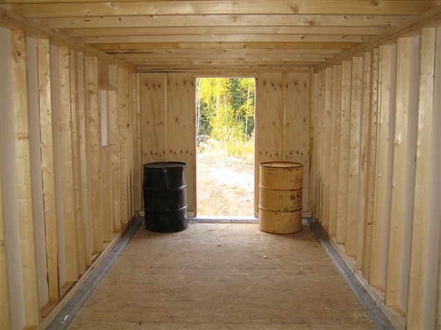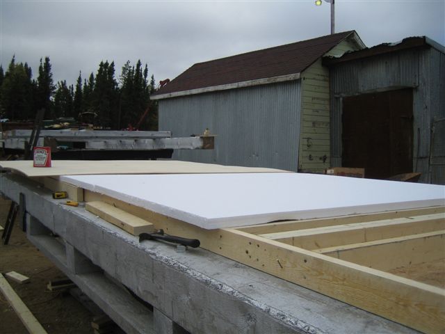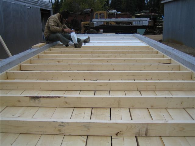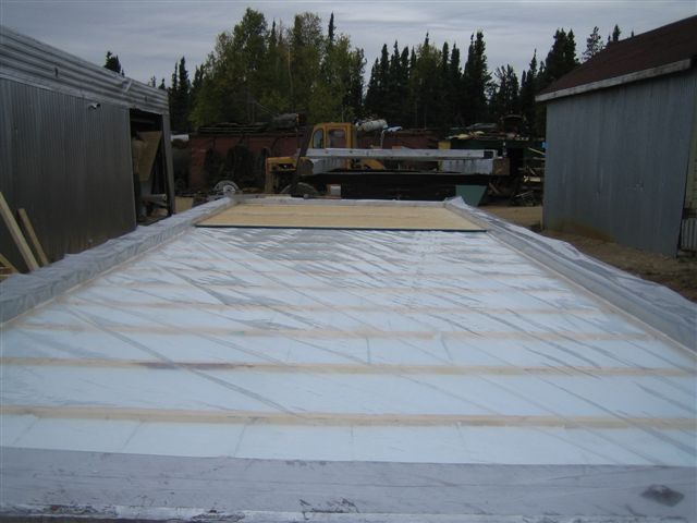 WE USED HEAVY PLASTIC AND TONGUE AND GROOVE PLYWOOD FOR A STRONG FLOOR AND GOOD WEATHER SEAL.